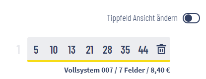 Die vielen Normaltipps sind nicht extra in einzelnen Tippfeldern aufzuführen, denn sie werden automatisch über die Systembezeichnung hinterlegt. So finden sich auf der Spielansicht einfach nur sämtliche angekreuzte Zahlen und Infos zum gewählten System.