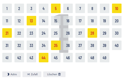 - Anwählen der sieben Zahlen 5, 10, 13, 21, 28, 35, 44.